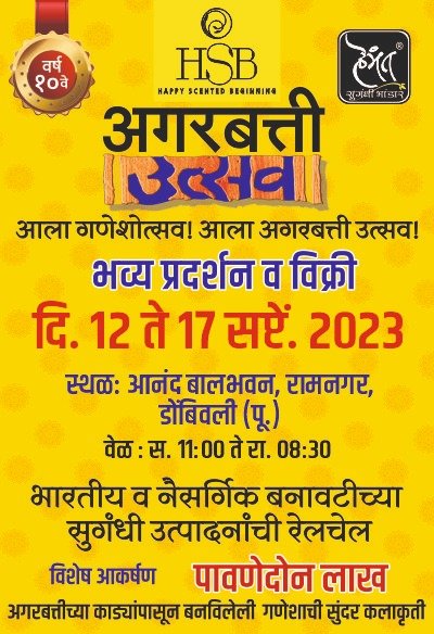 श्रीगणेशाच्या पवित्र मंगलमय अस्तित्वाचा आनंद द्विगुणित करण्यासाठी हेमंत सुगंधी भांडार (HSB) प्रतिवर्षी अगरबत्ती उत्सवाचे आयोजन करत असते. आमच्या दर्जेदार सुगंधकृती, प्रथितयश उत्पादकांची नावाजलेली उत्पादने, पूजा साहित्य व आकर्षक भेटवस्तू हे या उत्सवाचे वैशिष्ट्य.