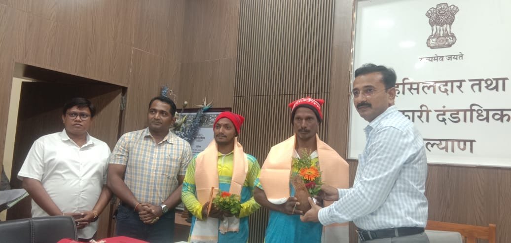 या धाडसी कार्याबददल कल्याण तहसीलदार सचिन शेजाळ यांच्याकडून गुरुनाथ हनुमंत पवार आणि त्यांचा मुलगा रोहन पवार यांचा आज सायंकाळी तहसील कार्यालयात शाल,श्रीफळ आणि रोख रक्कम देऊन सत्कार केला.