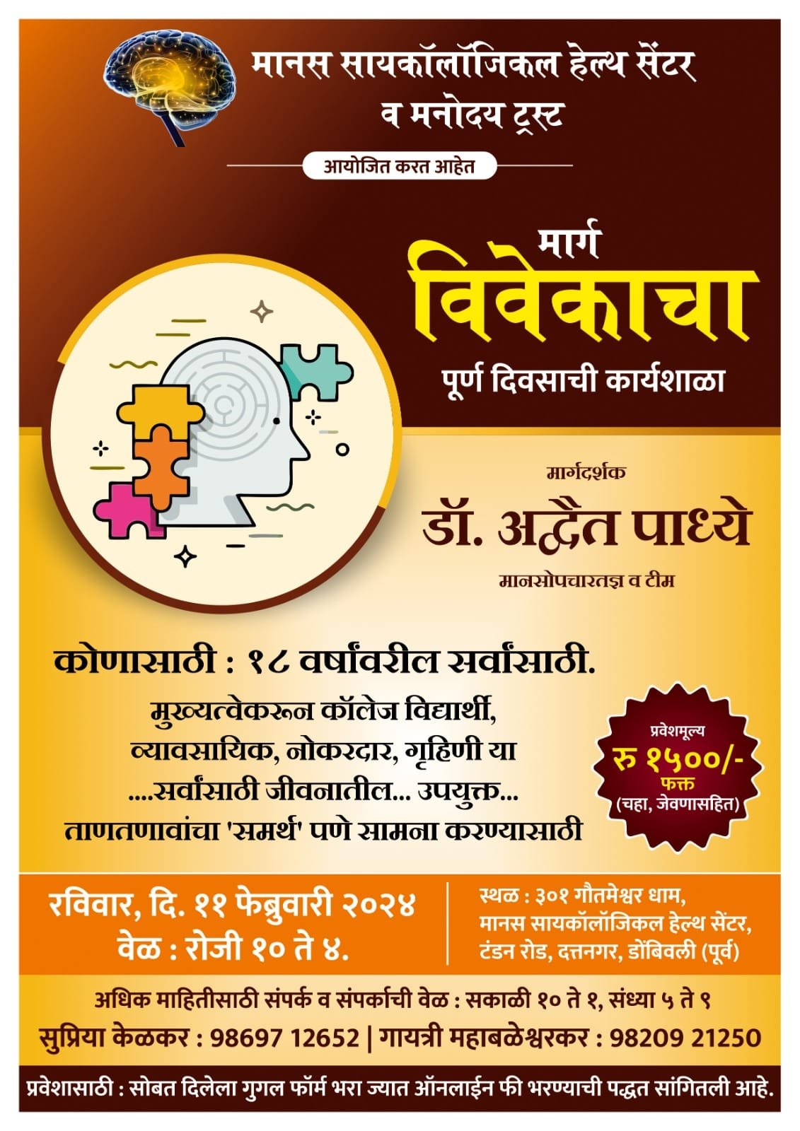 आपल्या रोजच्या जगण्यात आपण अनेक ताणतणावांना सामोरे जातो,अनेकदा तसं करताना वैफल्य,काळजी सारख्या भावना अनुभवतो पण तिथून पुन्हा उसळी मारून रोजचं जीवन सुंदर करण्यासाठी व चिंता,नैराश्य टाळण्यासाठी विवेकनिष्ठ विचार व भावना (REBT) या सर्वांची ओळख करून घेण्याची संधी मानस सायकॉलॉजिकल हेल्थ सेंटर व मनोदय ट्रस्ट आयोजित ११ फेब्रूवारी २०२४ रोजी “मार्ग विवेकाचा” पूर्ण दिवसाच्या कार्यशाळेत मिळणार आहे.