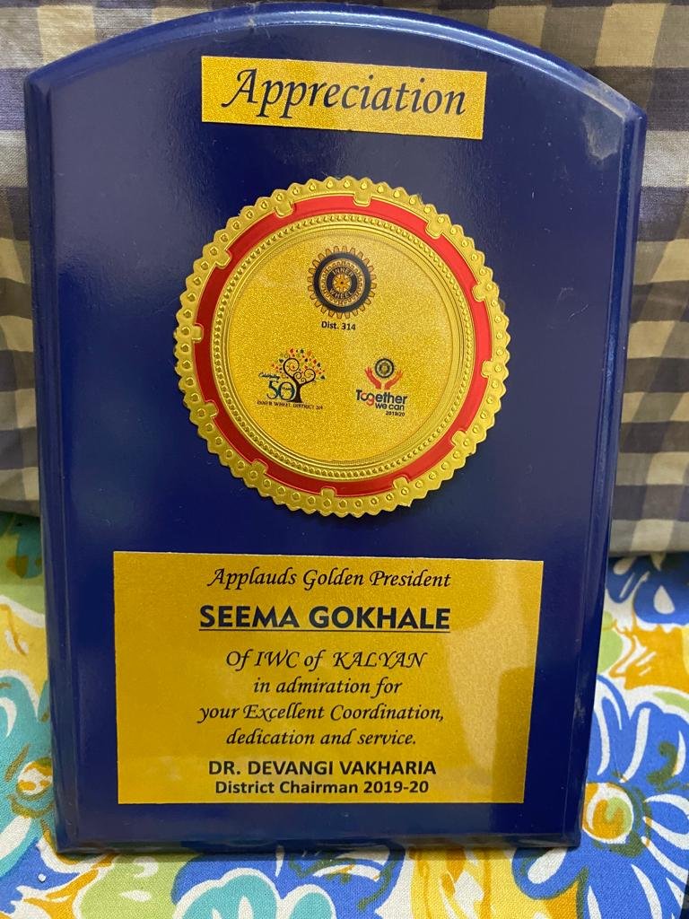 १४. इनरव्हील डिस्ट्रिक्ट ३१४ तर्फ़े उत्कृष्ट सहकार्य व सेवा बद्दल सम्मानित केले