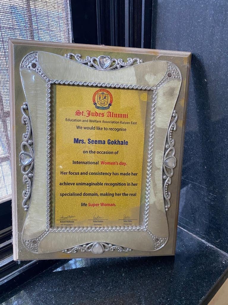 १३. कल्याण पूर्व मधील सेंट जुड्स अलुमनि एज्युकेशन असोसिएशन कडून रियल लाइफ सुपर वुमन अवार्ड ने सम्मानित केले आहे.